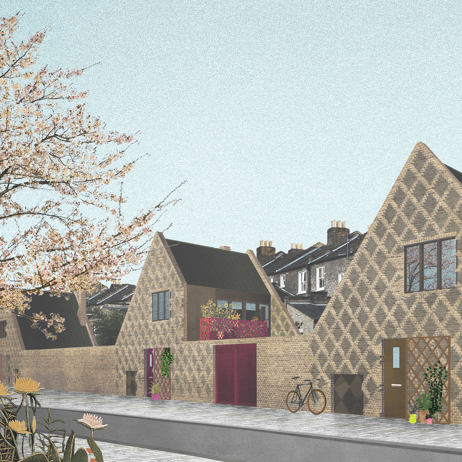 Twelve small houses on a former garage site close to Victoria Park in East London.