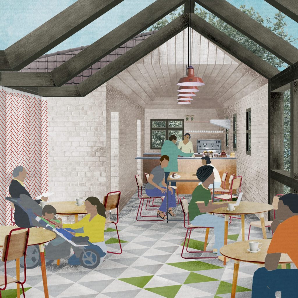 DK-CM also proposed a new community café housed in a transformed 1920s municipal toilet block. The café was designed to improve the usage, facilities and natural surveillance of its context, whilst providing programme to the new space and public toilet facilities to the public at large. The design intervention is primarily a real timber-frame extension to the ‘mock’ timber-frame of the original building, itself a tribute to the ancient Manor House which sits adjacent across the new square.