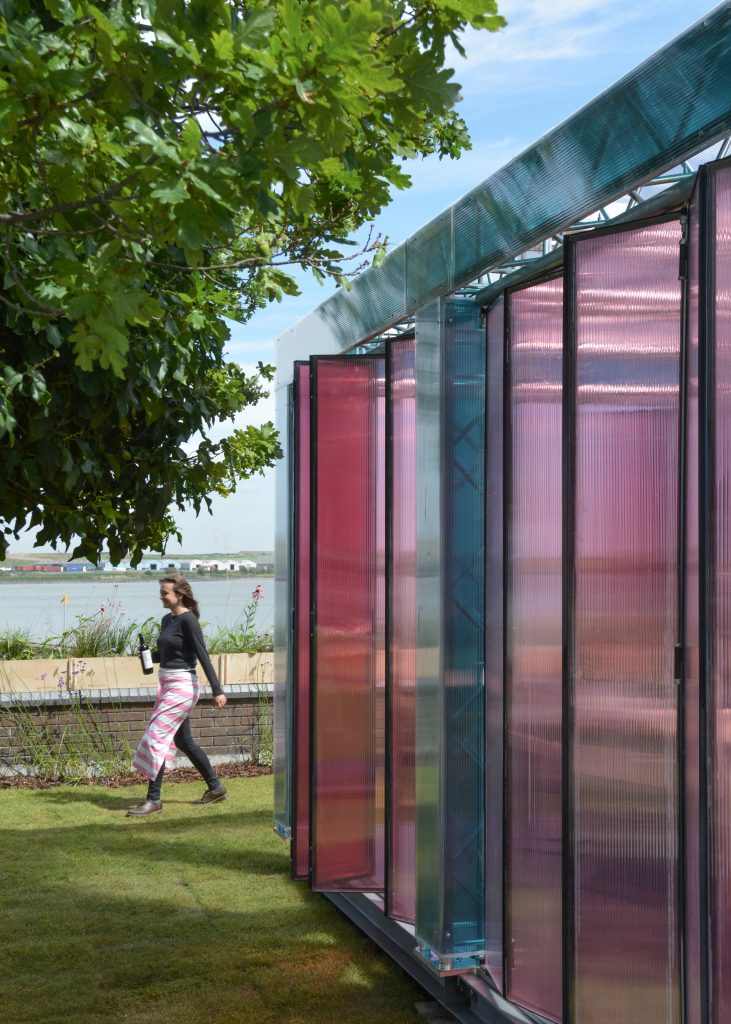 The Lighthouse is a flexible structure which folds open on all four sides to exploit views and adjacencies. With a structure made of theatrical rigging clad in polycarbonate, it is a distinctive and colourful presence on the riverfront. In its siting, form and function, it evokes the fragile structures that once lined the Thames locally whilst also borrowing languages from Erith’s industrial history.