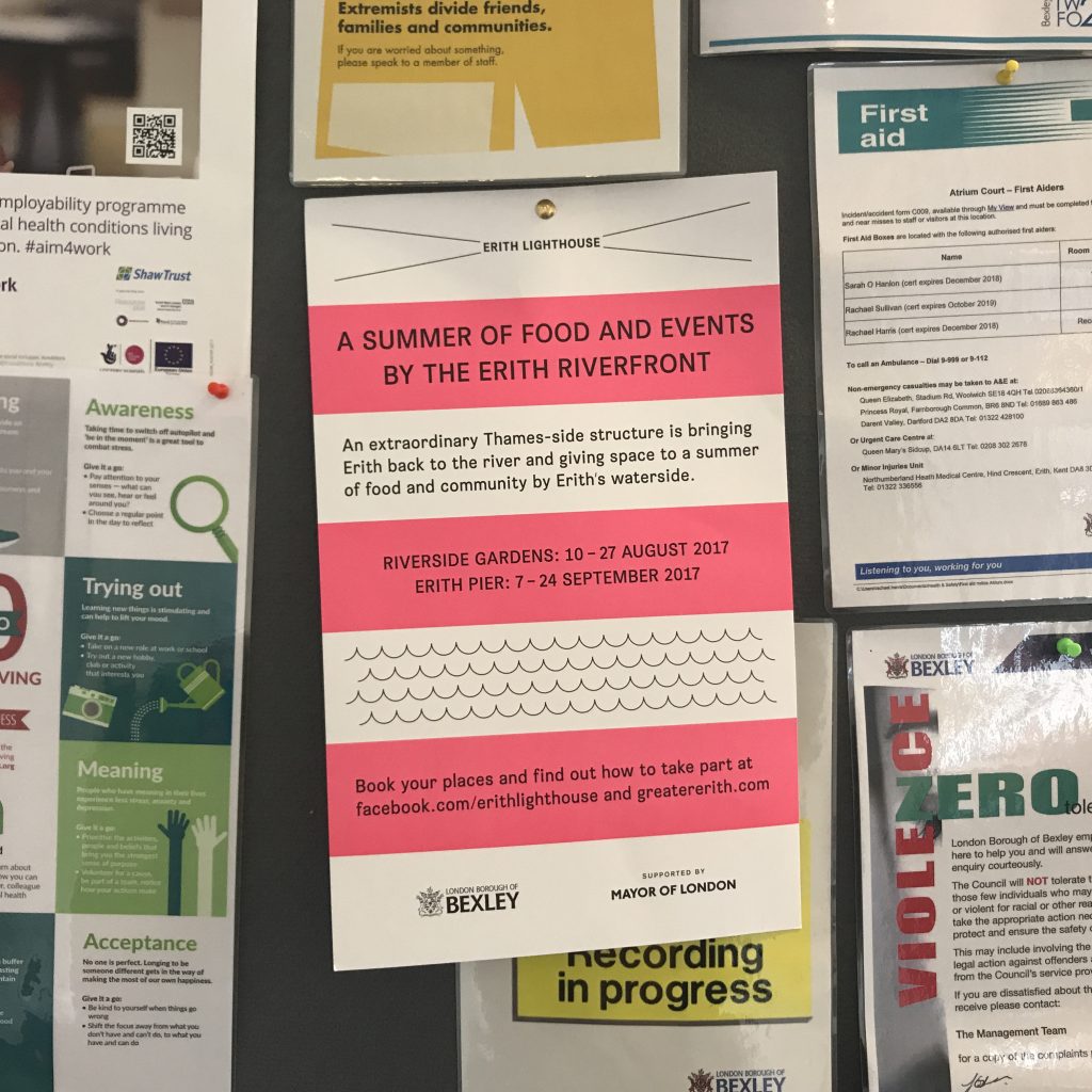 Erith Lighthouse stood at two locations alongside the Thames at Erith in Summer 2017. It hosted a community events programme, a daily café and a season of evening dining events, and aimed to celebrate Erith’s connection to the river and identity in the context of significant growth.